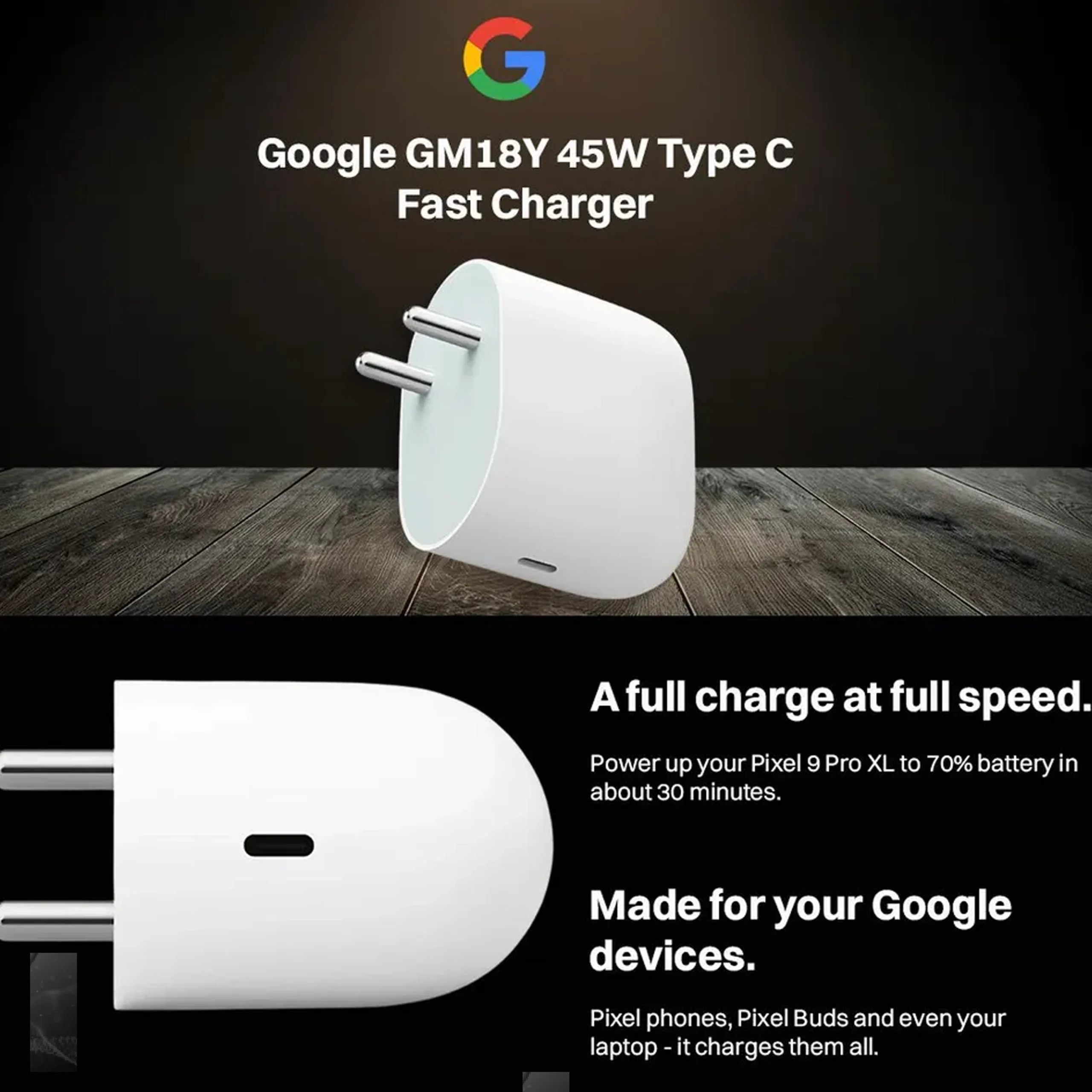 The 45W USB-C Power Charger delivers fast and efficient charging for all your Pixel devices.